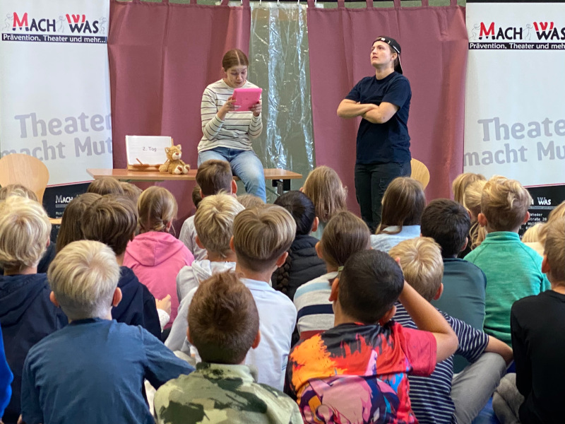 Im Anschluss an das Theaterstück fand für die 3. Klassen eine interaktive Nachbereitung mit den Darstellerinnen und Darstellern statt. Dabei konnten die Kinder Fragen stellen, eigene Erfahrungen einbringen und gemeinsam über sinnvolle Strategien im Umgang mit digitalen Medien nachdenken.