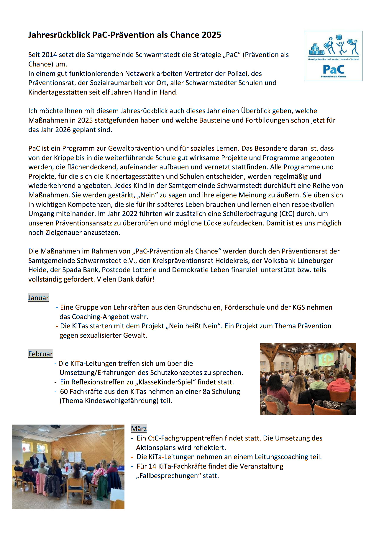 aktuell-2024-rueck Seit 2014 setzt die Samtgemeinde Schwarmstedt das Programm (die Strategie) „PaC“ (Prävention als Chance) um. In einem gut funktionierenden Netzwerk arbeiten Vertreter der Polizei, des Präventionsrat, der Pestalozzistiftung, aller Schwarmstedter Schulen und Kindertagesstätten seit zehn Jahren Hand in Hand.